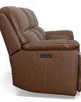 Inviting comfort and long-lasting support will make you want to stay nestled all day and night in the Jackson leather power reclining sofa. This sofa offers fine-tunable relaxation on the two outside seats with a dual power recline mechanism, adjustable headrests and Zero Gravity technology that reduces tension and pressure on the body. An attractive cross-stitch pattern on the back, armrest edges and footrests add distinctive style, while the waterfall chaise footrests and pillowy arms provide comfortable support. Built-in USB ports keep mobile devices conveniently charged and ready for streaming. With Flexsteel's patented Blue Steel Spring™ at the heart of each seat, and high-quality, whiskey brown leather, the Jackson power reclining sofa brings durability and a touch of rugged style to your home.
